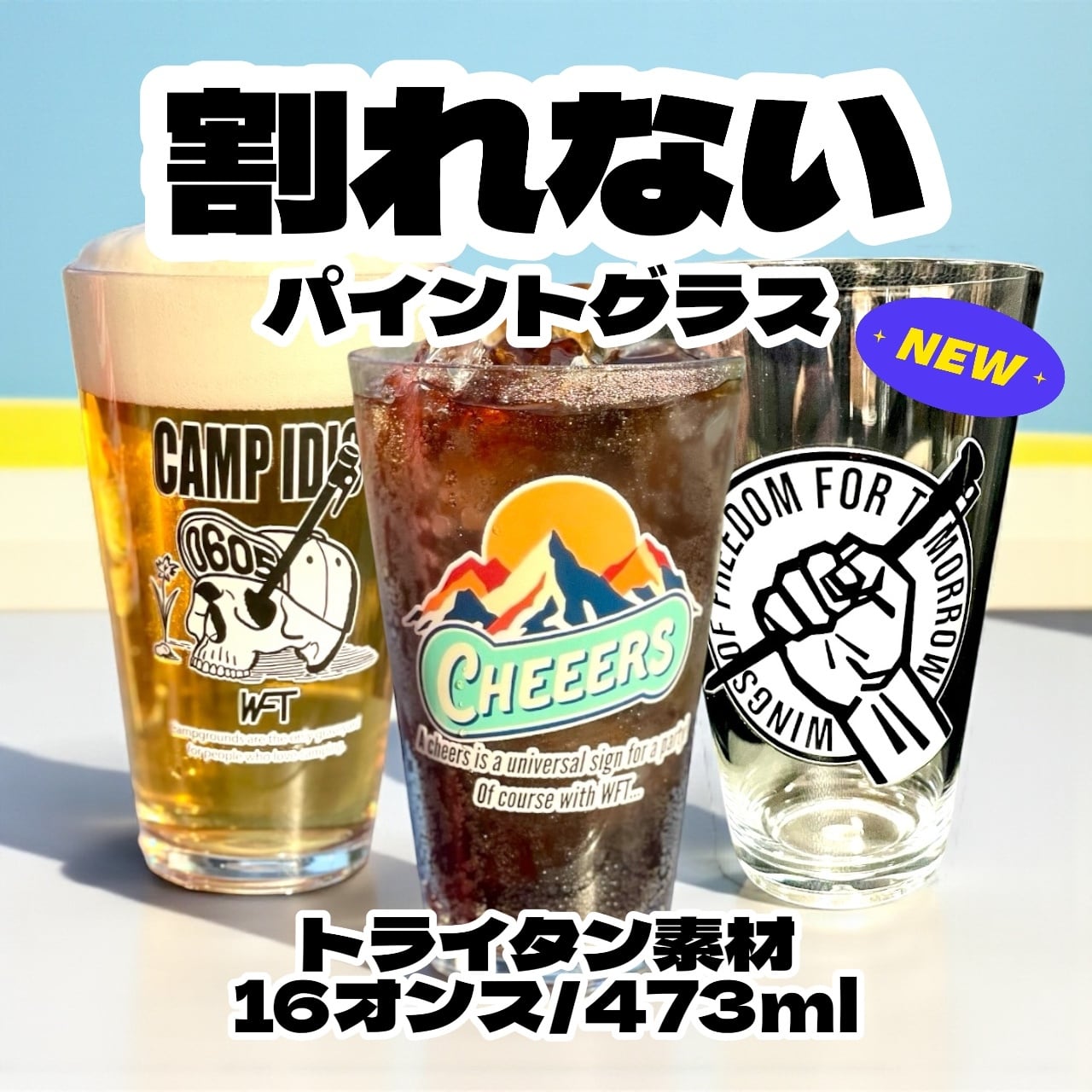 WFTオリジナルパイントグラス。ガラスより軽く割れないトライタン素材を採用。落としても割れないのでアウトドアシーンや取り扱いにもストレスフリーなアイテムです。